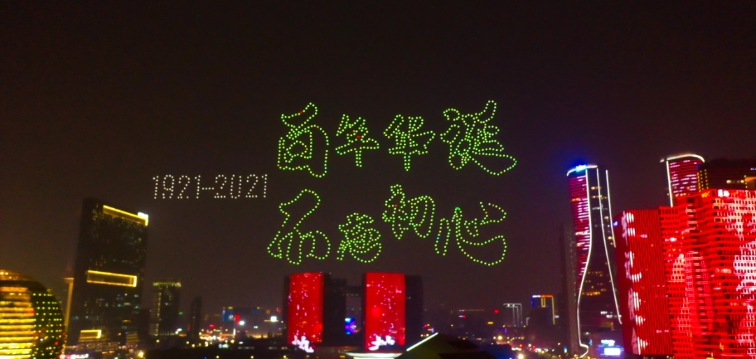 在钱江新城上演的“奋斗百年路 启航新征程”灯光秀时长12分30秒,整体结构分为“序章+3个篇章+尾声”五个部分,系统展现了中国共产党成立、发展的壮阔历程以及领导中华民族实现伟大复兴的辉煌成就,并融入了浙江、杭州的发展变化和地方文化特色。