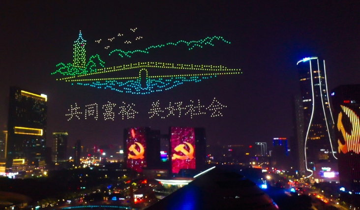 钱江新城,35幢楼宇联结成的2.3公里巨幅长卷恢宏展开,千架无人机编队姿态变幻;杭州东站,以“钱江潮”为主题,全面提升景观亮灯,迎接八方旅客;清河坊历史街区,“南宋风韵”和“现代科技”融合一体;武林广场,音乐喷泉随音符欢快跳动……从钱塘到临安,从临平到滨江,从淳安到富阳,1.68万平方公里土地上,呈现迈向共同富裕的美好图景。