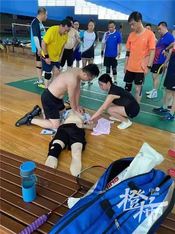 “早上,我去体育馆羽毛球馆晨练。球友们正打得热火朝天,6:05左右,11号球场的一位球友,突然倒地。附近球友看到了,大家都喊,‘快来人啊!这里有人倒地了。’我当时在17号场地,立即跑过去,上衣都来不及穿,先给男子进行了检查。没有感觉到脉搏跳动后,我意识到,可能是心源性猝死,需紧急抢救。”