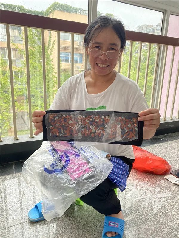 “在工地干活,手上都是老茧,容易磨到刺绣。”为保护已经绣好的刺绣,她们把一片塑料膜缝在上面。