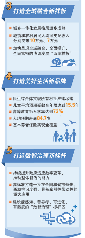 居民在家门口实现公共服务优质共享——做优民生综合体,完善“旗舰式”“星月式”“珠链式”三种模式,努力打造“10分钟公共服务优质共享圈”;办好全域优质教育,迭代升级集团化办学,做强做优学前教育,深入实施提质强校行动,深化“数智”教育等改革,进一步擦亮西湖教育“金字招牌”;深化“健康西湖”建设,推进优质医疗资源扩容和区域均衡布局,深化医联体建设和家庭医生签约,打造普惠托育服务体系;打响“幸福养老”品牌,深化康养结合“西湖模式”,持续推进“家庭养老床位”“适老化改造”“智慧养老社区”建设,全方位托起养老幸福梦。