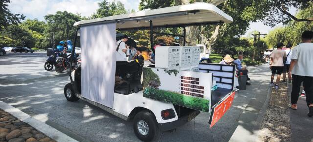 便民服务车刚投入使用时,车上还配了共享雨伞,支付宝扫码借伞,一小时内免费。后来考虑到车辆体积不足以携带大批雨伞,岳庙管理处决定,把雨伞配置到各个点位,比如断桥入口、平湖秋月入口、苏堤北口等等。