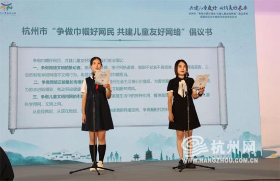 活动现场,杭州市妇联发出“争做巾帼好网民 共建儿童友好网络”倡议,由网民代表王蕾、儿童代表张睿恬宣读了倡议书。