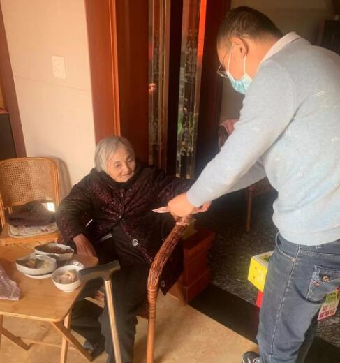 德北村村委谢志钧带领志愿者来到高龄老人家中,为老人送上慰问品,并向慰问对象致以新春问候与美好祝愿。