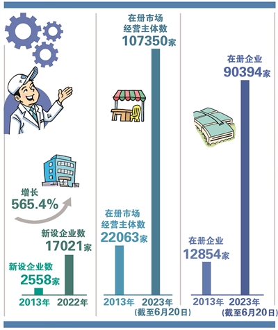 申办企业“时间线”的缩短,驱动力源自一场大刀阔斧、刀刃向内的“效能革命”。自2013年起高新区(滨江)启动商事登记制度改革,历时10年,这把“斧”劈开了一条市场经营主体的崛起之路——该区在册市场经营主体数量从2013年的22063家增长至107350家。而作为省、市商事登记制度改革试验区,高新区(滨江)的一个个先行先试,也为省市乃至全国提供了实践经验。