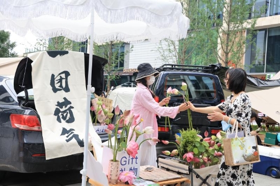 清丽雅致的荷花莲蓬在这里也能买到。“荷花5元一朵,莲蓬6元一个。”花艺师小梦为活动共准备了150朵荷花和50个莲蓬。现场除了爱花的女士,也有不少男士前来购买。