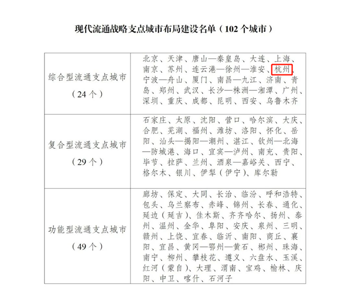 近日,国家发展改革委等多部门发文在全国范围布局建设102个现代流通战略支点城市。其中,杭州入选综合型流通支点城市名单。
