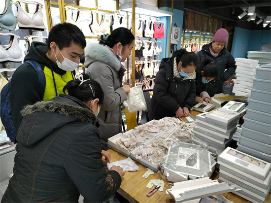 小甄来自上城区望江街道残疾人之家,从今年3月开始,她和另外几名工疗员在残疾人之家工作人员的陪同下,一周五天都去市场“工作”,一干就是六七个小时。她说:“我们不怕吃苦,希望能一直有活干。”她工作所在的商铺以销售内衣产品为主,现处于拿货旺季,每天需要来料加工人员进行加工出货。