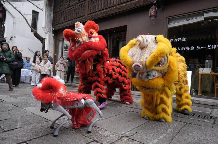 活动形态亦随之丰盈。从最初书院内的围炉夜话,逐步拓展至桥西景区、运河广场、博物馆群,形成广阔的“运河书事圈”。备受喜爱的“书福送福”,再次以笔墨传递最诚挚的新春祝愿。今年新增的“非遗竹马”与“拱宸颂福”流动演出,为街区注入灵动韵律与艺术雅韵。热闹的“年俗集市”上架了年糕、年糖、年宵花,市民一边采购年货,一边感受浓厚年味。